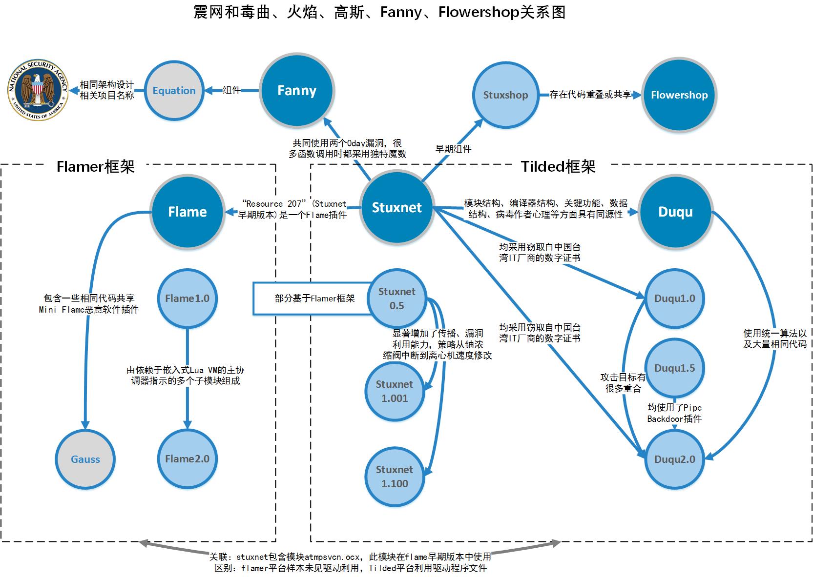 我们能判定“量子击穿”样本的来源归属,是基于对A2PT攻击组织的长期跟进分析的成果积累。美方在2005年开始,陆续推动了多代大规模高级恶意代码工程。卡巴斯基、安天都对此做出了持续跟进分析。卡巴斯基整体提出了第I代为Flamer框架,“火焰”(Flame) 1.0、“火焰” 2.0和“高斯”(Gauss)蠕虫均来自这个框架,也包括“震网”(Stuxnet) 0.5x版本的部分代码。第II代为Tilded框架,“震网”的大部分和“毒曲”(Duqu)多个版本基于Tilded框架。这与安天在当时的分析判断是一致的,包括跟进“火焰”蠕虫的分析中,安天提出尽管“火焰”比“震网”发现更晚,但其实是更早运营的样本,并进一步猜测,“火焰”的运用广泛面对中东实施的侦查环节,属于CNE(网络情报利用)阶段;而“震网”是最终实施CNA(网络作战打击)的攻击环节。并认为“震网”的阀门级联压力版本(即0.50版本)虽然曝光在后,但其是先于离心机转数篡改版本(即1.x版本)使用的等等。