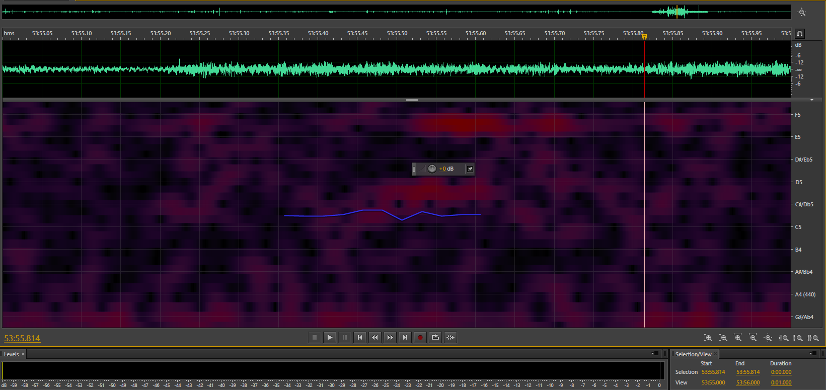 图3-8是正常录音音频所包含的波形频谱,图3-9为使用三角测量复现的录音频谱,虽然进行对比的正常音频采样频率和位深度都比三角测量录音的样本要高,但是在相同的时间内(1秒),三角测量录音中包含更多数据量,其波形变化比正常录音音频更加密集。