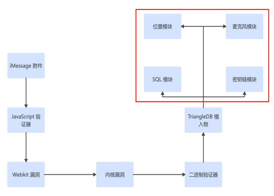 “三角测量”的关键功能模块化,如本次发现的位置信息窃取、麦克风监听、SQL数据库窃取、苹果秘钥链窃取,均为独立设计的模块,通过远程投递使用,如图4-1。这与方程式组织的UNITEDRAKE(联合耙)、DanderSpritz(怒火喷射)攻击平台设计思路一致。