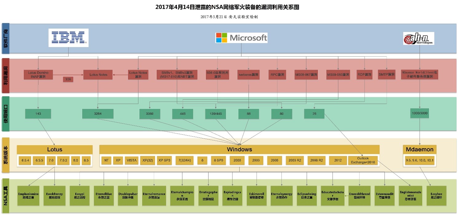 针对开放端口和服务的漏洞库(影子经纪人曝光泄露),我们称之为漏洞集合(S),即Service,服务端;这部分漏洞集成到可本地部署FuzzBunch漏洞攻击平台使用,内部使用传播范围更广。NSA已经泄露的攻击开放端口和服务的漏洞图谱[10]如图4-4。