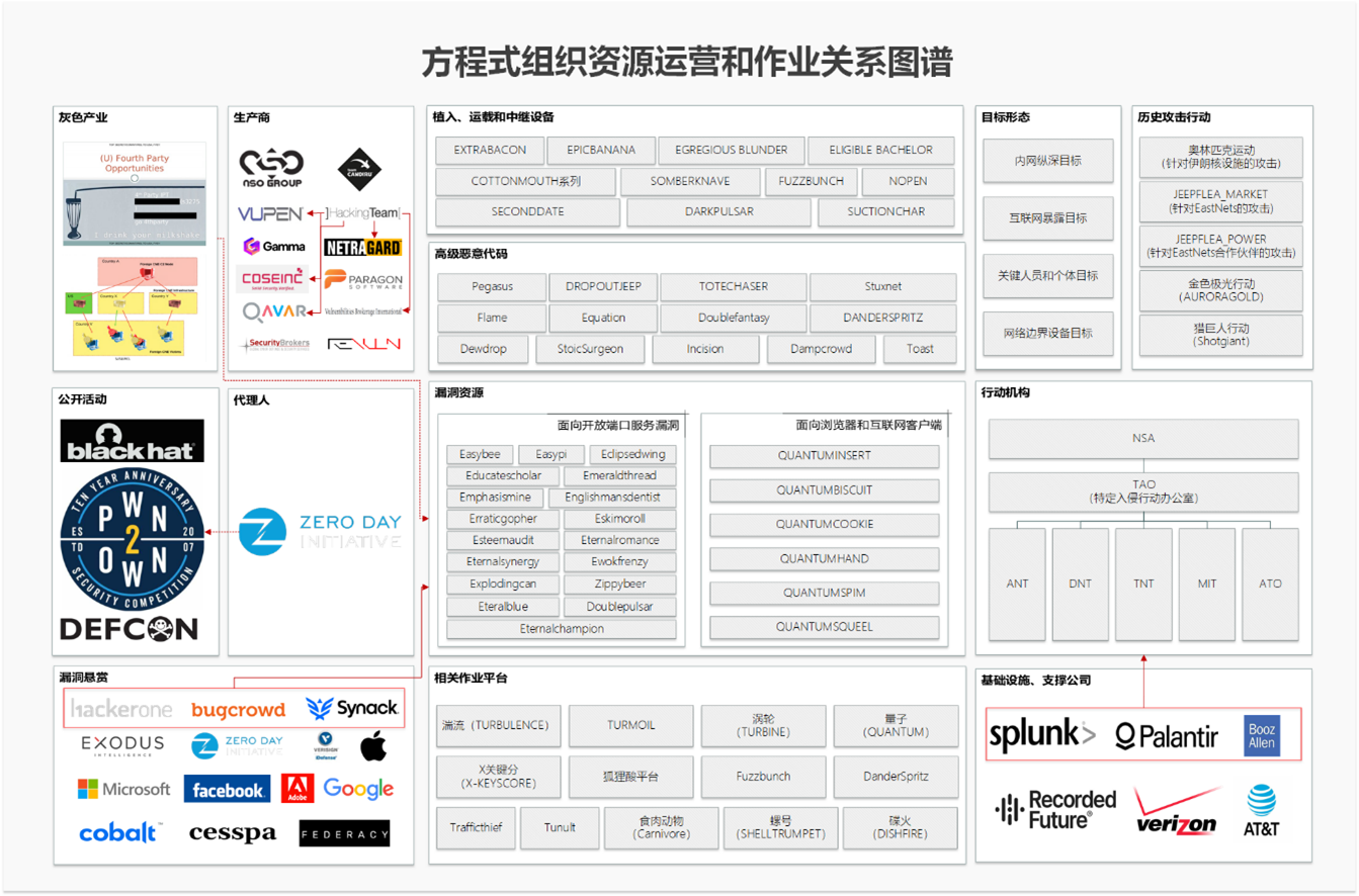 美方情报机构通过公开安全活动、代理人模式、漏洞悬赏合作以及与网络军火商采购的模式在全球搜集、采购0day漏洞,并通过与网空防务承包商、电信基础设施公司和互联网公司构建网空项目、武器、基础设施和大数据支撑,依托在全球部署的项目和作业平台,利用植入、运载和中继装备,通过漏洞投放各类高级恶意代码,针对全球IT目标发起大量攻击行动,其组织运营和作业关系图谱如图4-5。