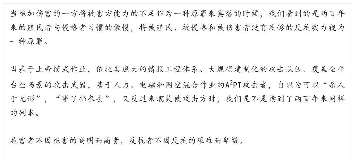 当基于上帝模式作业,依托其庞大的情报工程体系、大规模建制化的攻击队伍、覆盖全平台全场景的攻击武器,基于人力、电磁和网空混合作业的A2PT攻击者,自以为可以“杀人于无形”,“事了拂衣去”,又反过来嘲笑被攻击方时,我们是不是读到了两百年来同样的剧本。