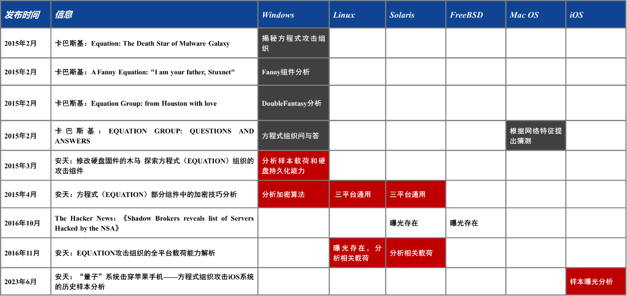 同时,卡巴斯基和安天也完成对方程式组织(即NSA TAO)多平台样本覆盖的接力,关于方程式攻击体系中各平台样本的首发曝光过程,如表1-2所示,Windows、macOS样本由卡巴斯基率先曝光,FreeBSD平台存在样本由卡巴斯基提出了猜测(未公开样本),Linux、Solaris样本由安天率先曝光。针对iOS攻击活动最早由卡巴斯基曝光,但首篇样本报告是由安天发布的。