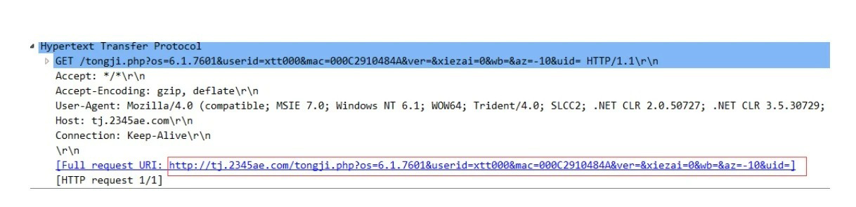 对样本进行抽样分析,针对某样本的回连信息http[:]//tj.ddd222.xyz/tongji[.]php?os={SS}&userid={SH}&mac={MC}&ver=&xiezai=0&wb=&az={IST}&uid=,回传用户的操作系统信息及MAC地址,该回连信息与历史“独狼”样本回传信息一致。