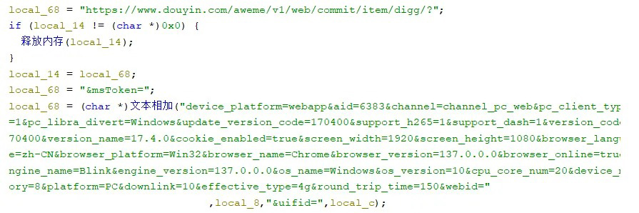 在刷取流量线程中,样本利用C2发送的盗取的用户凭证信息针对抖音发送请求,实现给视频推流、点赞与取消点赞的功能。