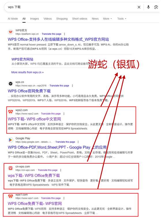 通过谷歌搜索引擎搜索“wps 下载”发现,第1页的第3、5、6位均是“游蛇”组织伪造的钓鱼网站,结果如图所示: