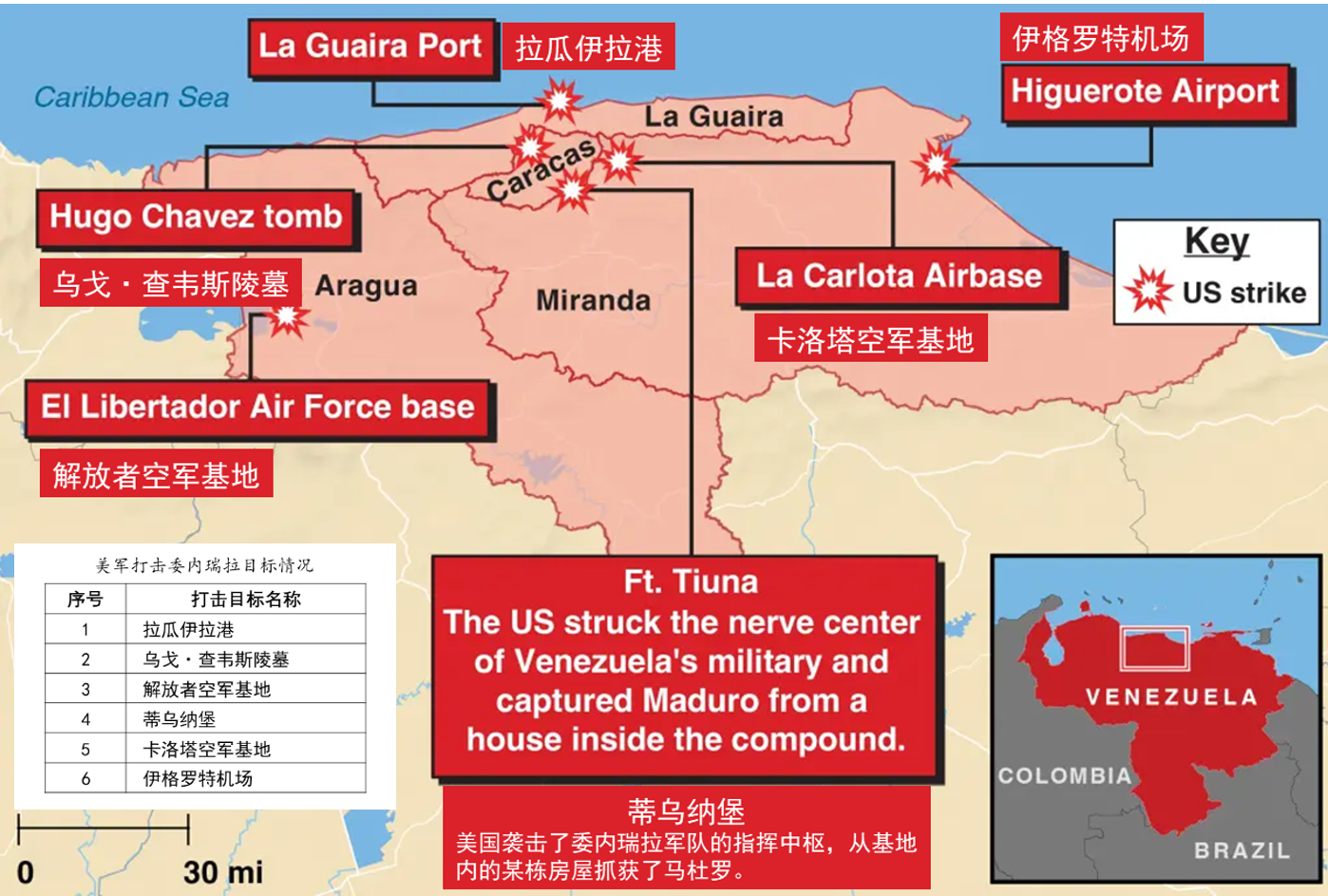 美方轰炸了委内瑞拉多个军事目标,包括拉瓜伊拉港、解放者空军基地、蒂乌纳堡、卡洛塔空军基地、伊格罗特机场等,均为军事和基础设施目标。但根据相关信息遭遇轰炸的包括乌戈·查韦斯陵墓,这显然是一个政治目标。其军事打击中,带有对后续认知影响的考量。